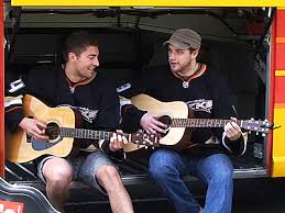 Joff and Bobby...yes, playing their guitars in the cargo hold of a charter bus...